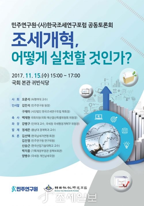 사단법인 한국조세연구포럼(학회장 구재이)은 국회 싱크탱크인 민주연구원(원장 김민석)과 함께 오는 15일 오후 3시 국회 본관 귀빈식당에서 '조세개혁, 어떻게 실천할 것인가?'를 주제로 문재인 정부의 세제와 세정분야의 구체적인 개혁방안을 논의하는 조세정책 토론회를 개최한다고 9일 전했다.