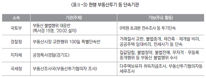 아울러 부처간 협력체계를 마련할 필요성이 제기됐다. 부동산시장 감독기구가 국세청, 지자체의 과세권을 포함해 경찰의 수사권 및 검찰의 기소권까지 통합적‧유기적으로 행사할 수 있는 투기단속체계를 구축해야 한다는 제언이다.