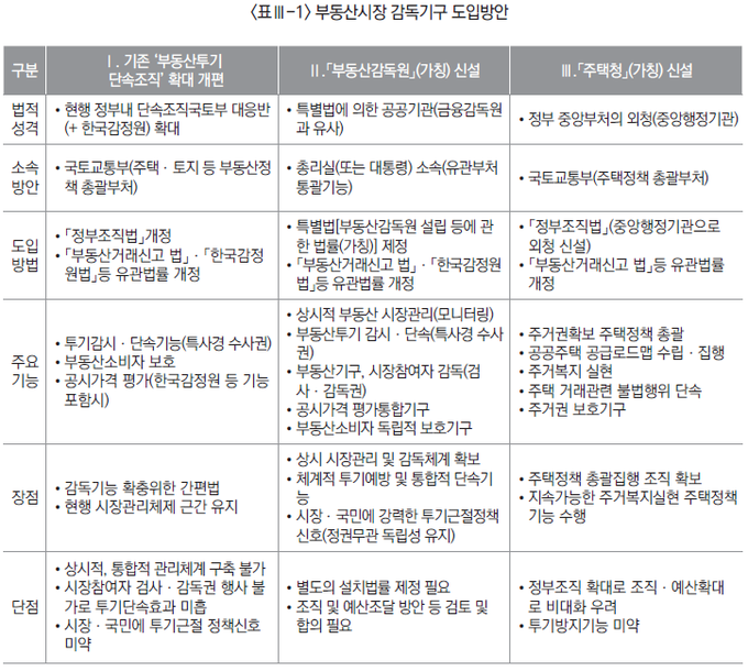 부동산시장 감독기구 도입방안으로 기존 ‘부동산투기 단속조직’의 확대개편, 금감원과 유사한 ‘부동산감독원’ 신설, 정부 중앙부처의 외청인 ‘주택청’ 신설 등을 고려할 수 있다는 의견이 제시됐다.