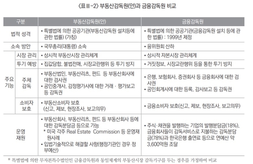 그러면서 특별법에 의한 공공기관으로 '부동산감독원(가칭)'을 신설하는 방안을 소개했다. 해당 기구는 현재의 금융감독원과 유사한 형태일 것으로 보인다.