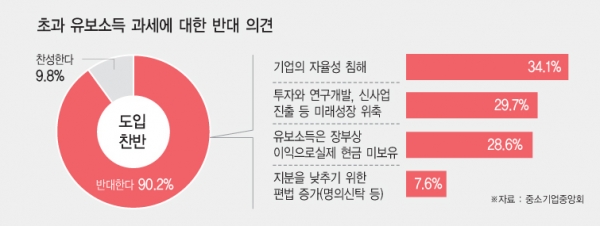 중기중앙회가 지난달 26일 발표한 ‘초과 유보소득 과세에 대한 중소기업 2차 의견조사’에 따르면 응답 중소기업의 90.2%가 초과 유보소득 과세를 반대했다. 1차 조사에 비해 28.9%p 증가한 수치다.