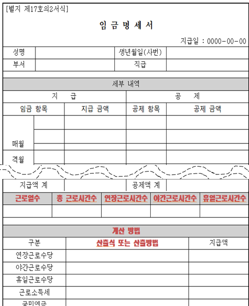 뿐만 아니라 임금의 각 항목별 계산방법 등 임금총액을 계산하는데 필요한 사항, 임금의 일부를 공제한 경우에는 공제 항목별 금액과 총액 등도 빠뜨리면 안된다.