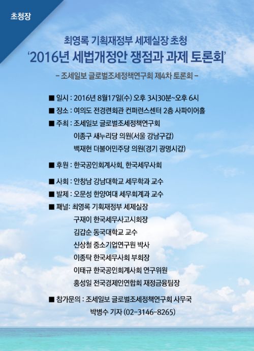 조세일보 글로벌조세정책연구회(이하 연구회)는 오는 17일(수) 연구회 특별회원인 이종구 새누리당 의원, 백재현 더불어민주당 의원과 공동으로 최영록 기획재정부 세제실장을 초청, '2016년 세법개정안 쟁점과 과제'를 주제로 한 제4차 토론회를 개최한다.