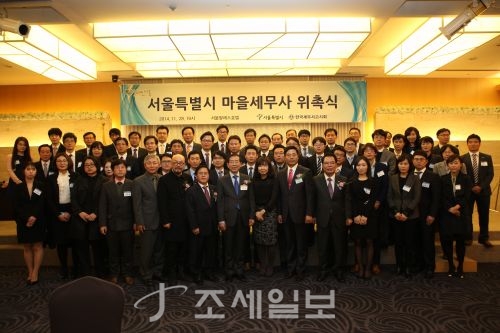 ◆…지난 2014년 11월 서울팔래스호텔에서 열린 서울특별시 마을세무사 위촉식에서 박원순 서울시장(앞줄 왼쪽 여덟번째), 백재현 더불어민주당 의원(앞줄 오른쪽 다섯번째), 구재이 세무사고시회장(앞줄 오른쪽 여섯번째)을 비롯한 마을세무사들이 기념촬영을 하고 있다.
