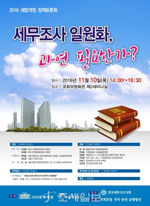 서울시는 오는 10일 국회의원회관 제2세미나실에서 '지방소득세 세무조사의 합리적 보완방안'이란 주제로 2016 세법개정 정책토론회를 개최한다고 8일 밝혔다.