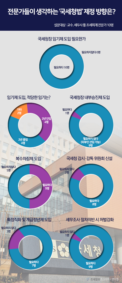 조세일보(www.joseilbo.com)는 교수, 세무사 등 조세전문가 10명(조세일보 글로벌조세정책연구회원)을 대상으로 국세청 개혁을 위한 수단 중 하나인 '국세청법 제정'에 대한 설문조사를 통해 의견을 듣는 기회를 마련했다.