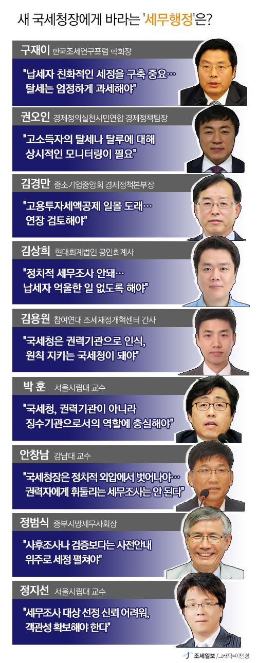 김상희 현대회계법인 공인회계사는 "실무현장에서 보면 납세자에게 국세청은 아직도 어렵고 무서운 곳으로 인식되고 있다"며 "새 국세청장은 정치적이고 권력지향주의적인 세무조사를 하지 않고 법과 원칙에 따라 공정하고 투명한 세무조사가 이뤄지도록 해야 한다"고 밝혔다.