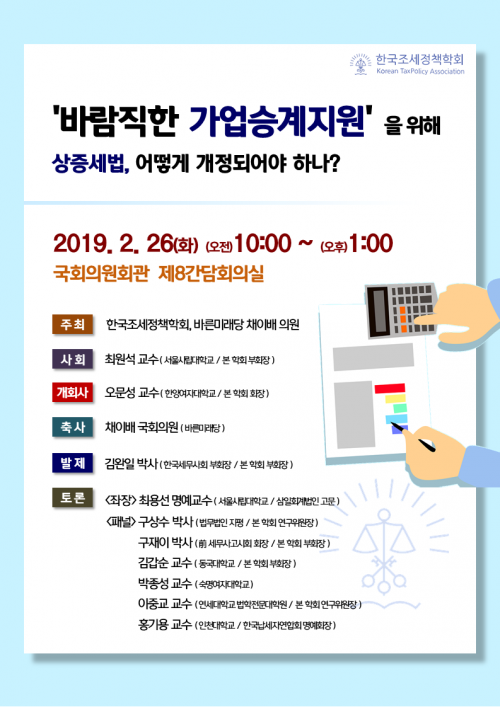 토론회 발제는 김완일 한국세무사회 부회장이 기업의 바람직한 가업승계지원을 위한 상증세법 개선방향에 대해 다룰 예정이다.