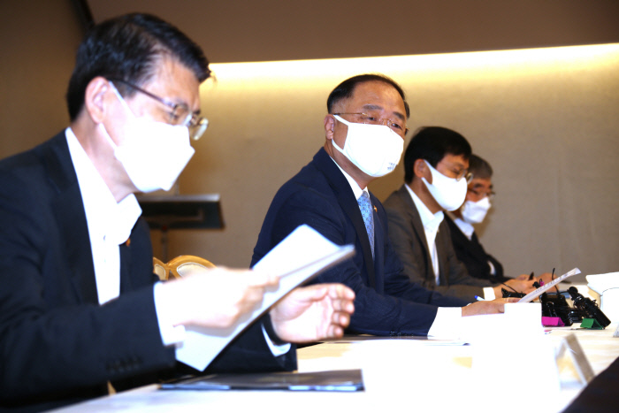 회의 주재하는 홍남기 부총리 홍남기 부총리 겸 기획재정부 장관(왼쪽에서 두번째)이 2일 정부서울청사에서 열린 제5차 부동산시장 점검회의를 주재하고 있다. 연합뉴스