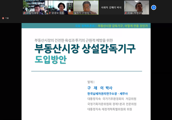 이날 발제를 맡은 구재이 세무사(한국납세자권리연구소장)는 부동산시장 상설감독기구의 도입 필요성과 함께 도입방안으로 기존 조직 확대, 부동산감독원 신설, 주택청 신설 등의 형태를 소개했다.