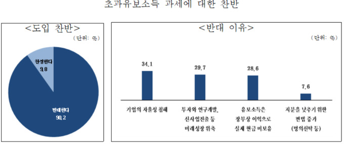 중기중앙회가 지난 22일 중소기업 309개사를 대상으로 실시한 설문조사에서도 응답기업의 90.2%가 초과 유보소득 과세방침에 반대했다. 기업의 미래성장 동력을 훼손할 뿐만 아니나 투자의사결정에 대한 기업의 자율성을 침해한다며 정부안 철회를 요구했다.