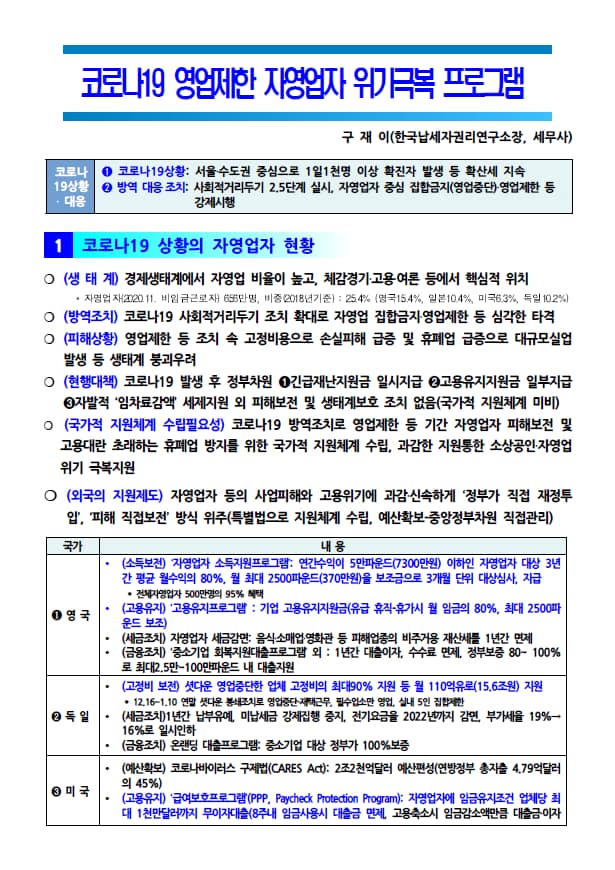 코로나19 방역조치에 따른 피해보상기준을 정할 때 과거 대비 매출이나 이익의 감소분을 구해 보상금을 정하는 게 왜 소급입법이냐는 문제제기도 나왔다. 구 소장은 “피해상당액 실손 보상이 대원칙인만큼 객관적 지급기준을 정한 것이 ‘소급입법 금지원리’가 적용될 수 없나”고 되묻고 납세자에게 혜택을 주는 입법을 ‘소급입법’으로 간주하는 무지함을 꾸짖었다.