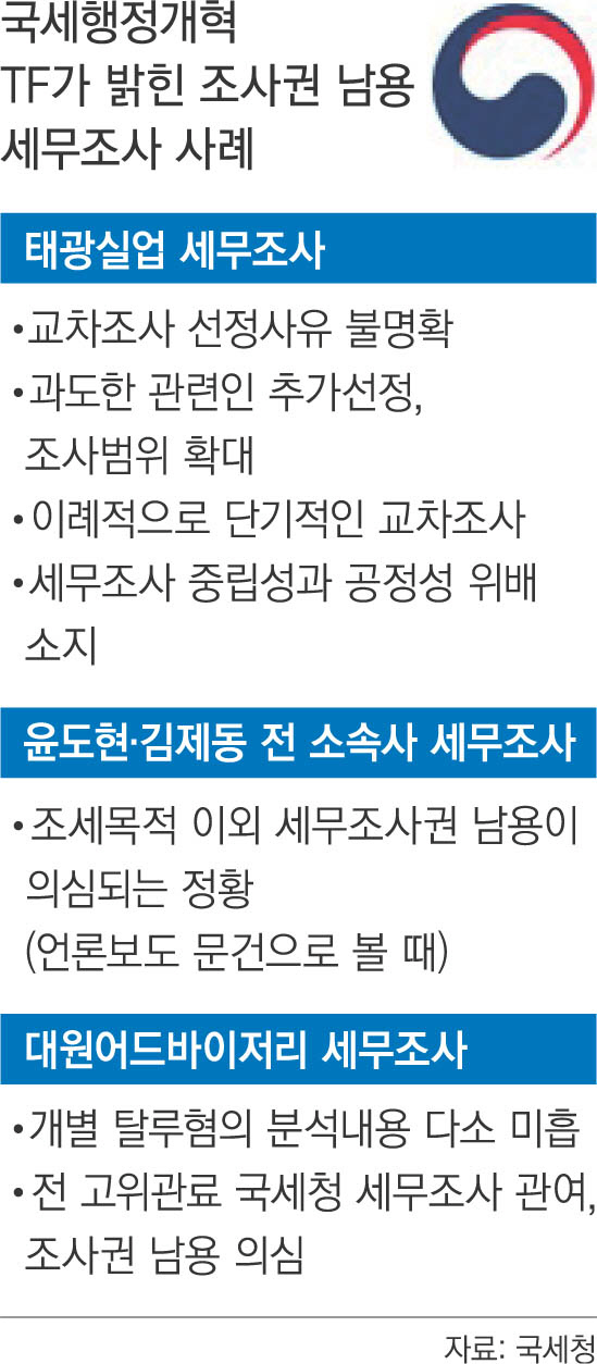 국세청 국세행정개혁 태스크포스(TF)가 2008년 국세청의 태광실업 특별 세무조사에 대해 중대한 조사권 남용이 있었다는 결론을 내린 것은 이명박·박근혜 정권에서 일부 세무조사가 정치적 목적으로 실시됐다는 것을 확인한 것이다. 국세청발 ‘적폐청산’ 작업이 시작됐다는 해석이 나오지만 당시 세무조사에 연루된 국세청 직원에 대한 대면조사가 이뤄지지 않는 등 한계도 노출했다. 국세행정개혁 TF는 과거 정치권과 언론 등에서 논란이 제기된 62건의 세무조사에 대해 점검했으며 이 중 5건에서 국세기본법상 조사권 남용이 의심되는 객관적 정황을 확인했다고 20일 밝혔다.
